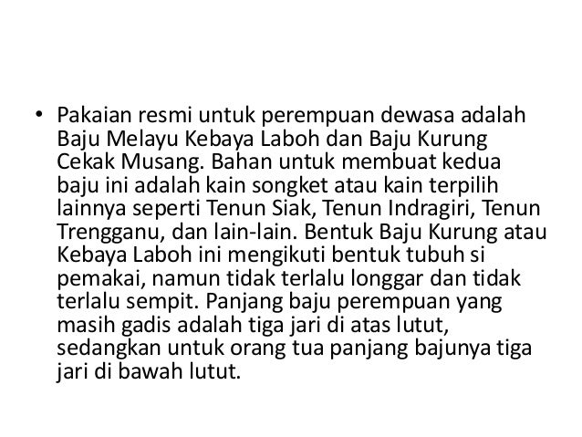 Sementara perempuan Melayu dewasa memilih 3 jenis baju yang disebut Baju Kebaya Pendek Baju Kurung Laboh dan Baju Kurung Tulang Belut Baju baju ini digunakan bersama kain selendang sebagai penutup kepala saat pergi berladang c Pakaian Keseharian untuk Orangtua Laki laki sepuh atau setengah baya mengenakan Baju Kurung Cekak Musang atau Baju